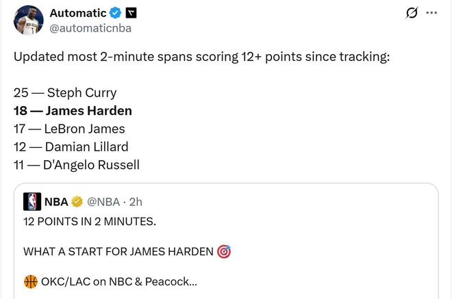 值得一提的是,哈登在此役还创下了NBA历史第2的神迹。哈登在首节2分钟内得到12分。据统计,自有相关数据统计以来(96-97赛季NBA逐回合统计场上数据),哈登共18次2分钟内得到12分,可排历史第二,勒布朗詹姆斯、利拉德分别排在第3、第4的位置。